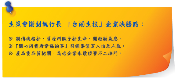 台酒生技未來的發展值得令人期待,一個歷史悠久的企業,願意改變、願意創新,實在難得。林協理的人生觀「凡事盡力、正面思考、樂觀,帶來正向能量」,也讓事業部走出自有特色,永續下一個百年絕非難事。