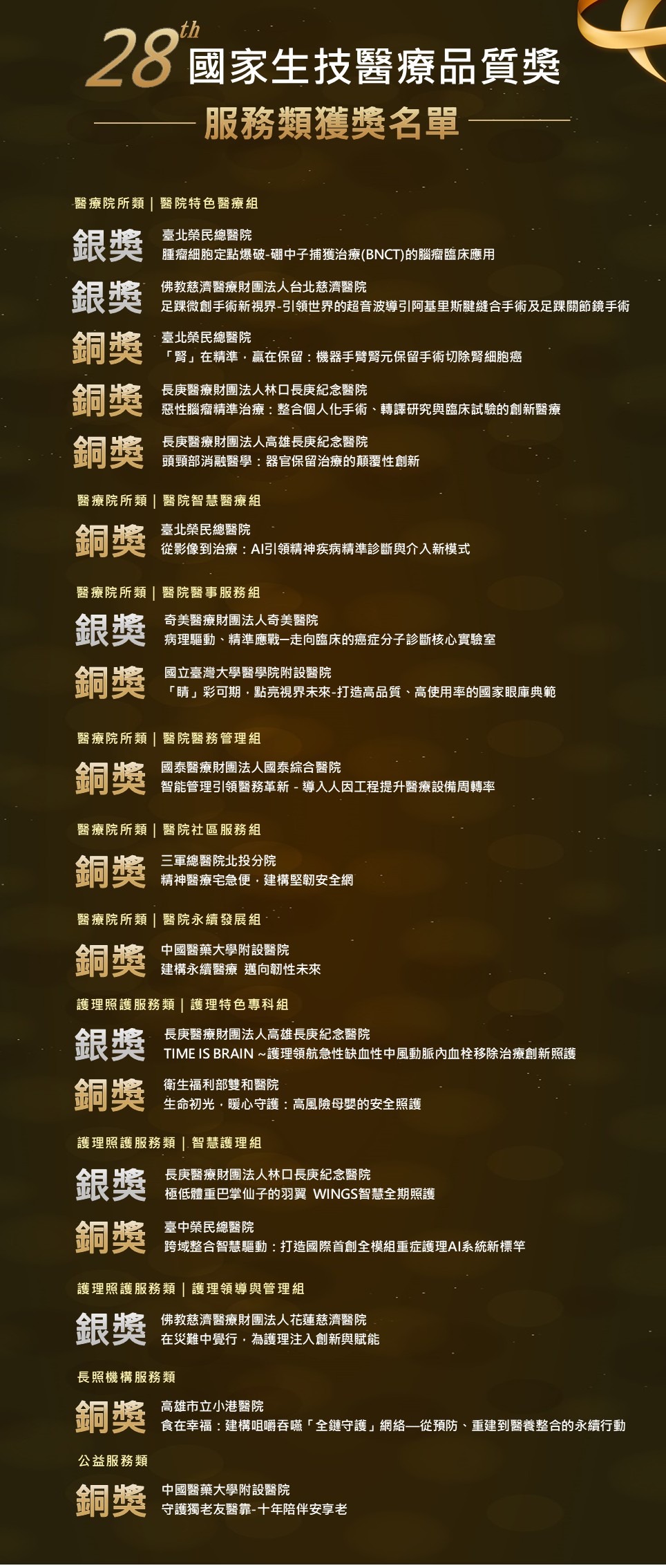 第28屆 國家生技醫療品質獎 服務類獲獎名單
